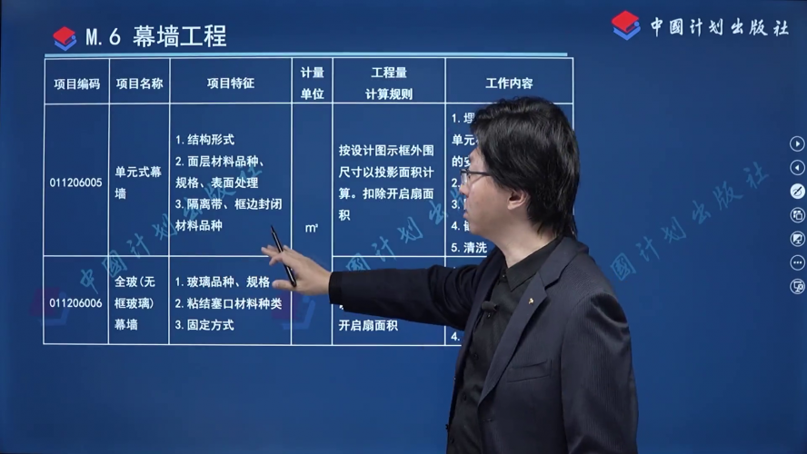 来 源:GB/T 50854-2024 房屋建筑与装饰工程工程量计算标准 > 附录M 墙、柱面装饰与隔断、幕墙工程 > M.6 幕墙工程